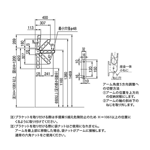 ・ブラケットを取り付ける際は手摺乗り越え危険防止のため H=1061以上の位置にくるように取り付けてください。