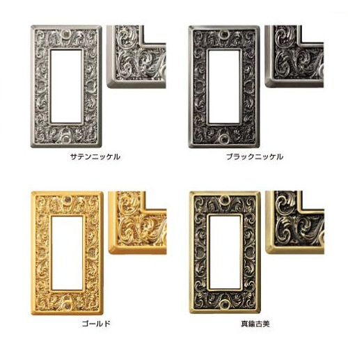 ・中世ヨーロッパ調の優美な唐草模様を彫り込んでいます。 ・絵画の額縁のような繊細なレリーフに、4つのカラーで、さまざまなシーンに対応します。 ・埋込スイッチ、コンセントとコーディネートできます。 ・既存のものや、掲載品以外のスイッチ、コンセントを使用する場合は事前に品種をご確認ください。
