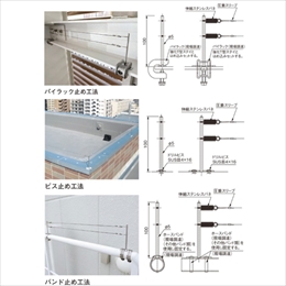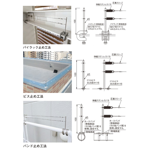 ・従来からのワイヤー方式における耐久性を強化し、美観面を良くしたオリジナルの工法対策を取入れたスマートで実用性の高い防鳥ワイヤーです。 ・部材は全てSUS304を使用することで、耐久性と高級感のある仕上がりになります。 ・端部・中間部共通の支柱は、ワイヤーの2段使いが可能です。 ・パイラック、ホースバンドを使用することで、様々な場所にも取付けが可能です。