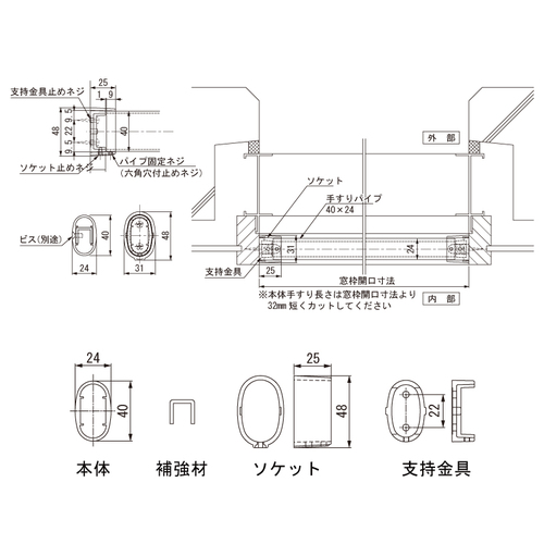 ・窓枠開口寸法(額縁内寸法)より、32mm短くカッ卜してください。 ・パイプ長さ1500mm以上の場合は、補強材をご使用ください。 ・パイプ長さ4000mmもご用意できます。1800mmより長いサイズをお求めの場合はお問い合わせください。 ・パイプ長さ1800mm以上でご使用の際は、中間支持を設けるなど考慮してください。 ・納期:ご確認ください。