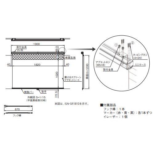[イメージサイズ]W1820×H1020mm [外径寸法]64×70×1900mm [映写可能サイズ](16:9)82、(16:10)75、(4:3)67 [質量]6.2kg [付属部品]フック棒:1本、マーカー(赤・青・黒):各1本づつ、イレーザー:1個