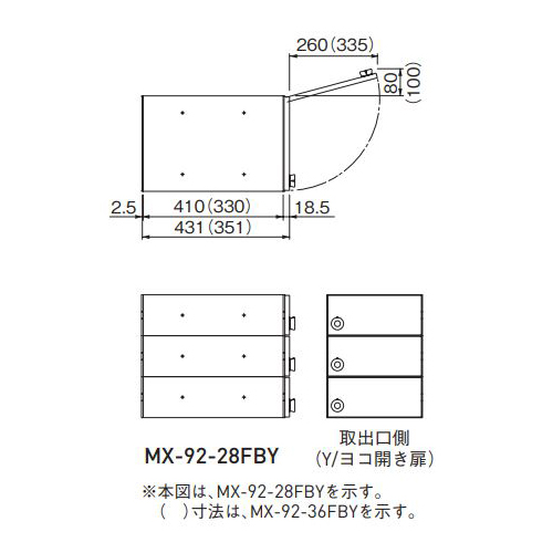 [戸数]2戸用 [投入・取出側]前入後出(FB) [材質]ステンレス・ポリカーボネート [仕上げ・色]ヘアーライン [サイズ]H120×W360×D351mm [投入口サイズ]344×35mm [重量]6.2kg [扉]ヨコ開き扉(Y)