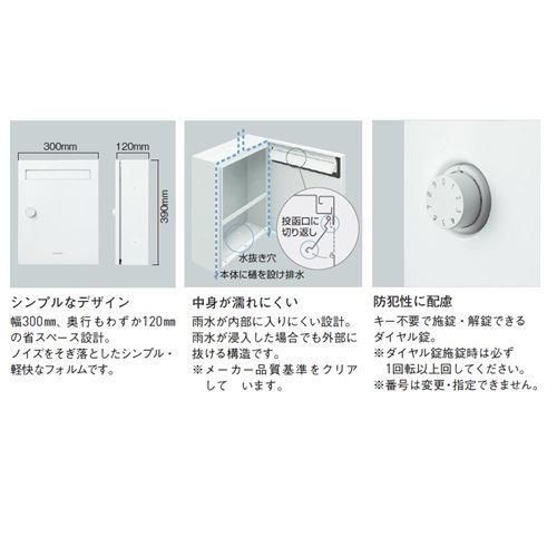 [色]漆喰ホワイト [品番/呼称]CTCR2502WS [サイズ]H390mm×W300mm×D120mm [重量]4.1kg [材質]本体・扉:SGCC鋼板(粉体塗装)、投函口:ASA樹脂(アクリル塗装) ダイヤル錠:耐候性樹脂
