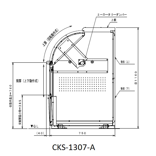 ・CKSの前パネル部分がポリカボネートの仕様 ゴミ収集庫の中が見える構造なので庫内の視認性に優れています ・デッドスペースが少なく、だれでも操作がしやすい回転式上扉 ・高耐久のロータリーダンパーを標準装備(左右1個ずつ) ・内側からレベル調整が可能(高さ調整範囲は0~40mmです) ・世帯数の少ない集合住宅や店舗などに最適