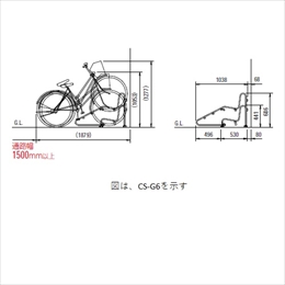 [収納台数]2台 [品番]CS-G2(低位用×1台、高位用×1台) [材質]スチール [サイズ]高さ686mm、幅798mm、奥行1038mm ●収納可能自転車 [質量]40kg以下 [タイヤ径]20〜28インチ [タイヤ幅]55mm以下 [全長]1450mm以上 [ハンドル幅]600mm以下 [ハンドル高さ]1100mm以下 [スタンドピッチ]400mm