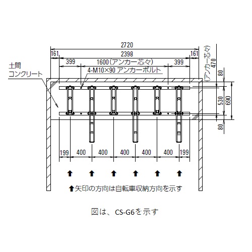 [収納台数]6台 [品番]CS-G6 [材質]スチール [サイズ]高さ686mm、幅2398mm、奥行1038 mm ●収納可能自転車 [質量]40kg以下 [タイヤ径]20〜28インチ [タイヤ幅]55mm以下 [全長]1450mm以上 [ハンドル幅]600mm以下 [ハンドル高さ]1100mm以下 [スタンドピッチ]400mm