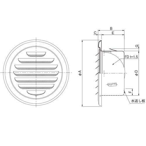 ・FD付は特定防火設備該当品です。 ・防火ダンパー:公称作動温度72℃ ・取付ダクトは、ねじれ・変形のないこと、また壁仕上り面まで施工されていることを予めご確認ください。 ・本製品を取り付ける前に、必ずダクト内の清掃を行ってください。 ・防水処理に使用するシーリング剤は、施工後の経年劣化によるひび割れなどで隙間を生じさせないためにも、酸化性のものを避け柔軟性を保つものをご使用ください。