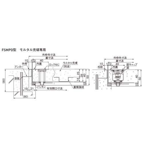 [材質]SUS304 [仕上]ヘアーライン [備考]ハンドル無し・モルタル専用・鍵付き [蓋補強材]2本 [耐荷重]:5kN/平方メートル [サイズ]開口寸法:558、外枠外寸法:600、蓋寸法:578 [重量]6.8kg