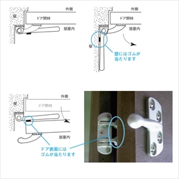 ・ゴムのクッションで、ドア、壁に傷がつかない構造です。 ・ドアを施錠させないためにドアガードを使用する場合が見受けられますが、このような場合もドアの表面にはゴムが当たり傷がつきません。