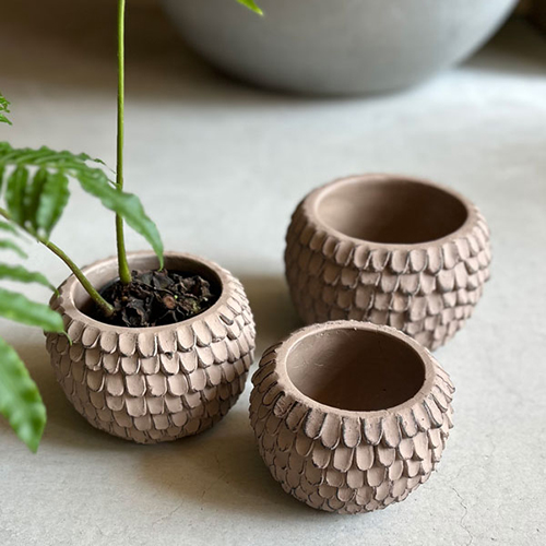 松ぼっくりのようなフォルムの鉢カバー。
