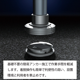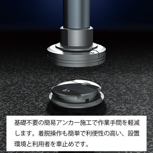 ・基礎不要の簡易アンカー施工で作業手間を軽減します。着脱操作も簡単で利便性の高い設置環境と利用者を考えた車止めです。