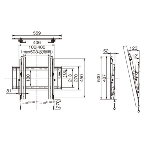 ・傾斜角度調整タイプです。 ・VESA対応規格:最小100×100mm、最大508×450mm [材質]スチール [仕上げ]半つや焼付塗装 [対応サイズ]32〜65インチ [取付重量]〜56.7kg [重量]6.0kg