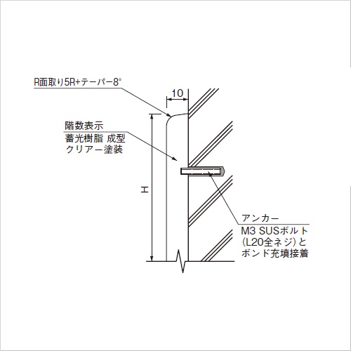 ・消灯直後は明るく発光します。30分後〜1時間では、徐々に発光が薄くなります。1時間後〜10時間では、文字の形が目視できる残光状態です。 [品番/呼称]NST01 [サイズ]H150mm、W80mm、D10mm [重量]80g [材質]エポキシ系樹脂・蓄光ガラスビーズ [仕上げ]クリアー塗装 [ご注意] ・文字を発光させるためには、事前に光りを当てておく必要があります。 ・アンカーと接着にて施工します。