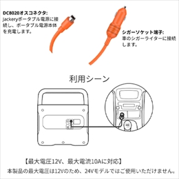 ・本製品の最大電圧は12Vのため、24Vモデルではご使用いただけません。また、Jackeryポータブル電源専用ケーブルとなるため、Jackery製品以外でのご使用は避けてください。他ブランドを使用して生じた損失については保証対象外となり、弊社は一切責任を負いません。
