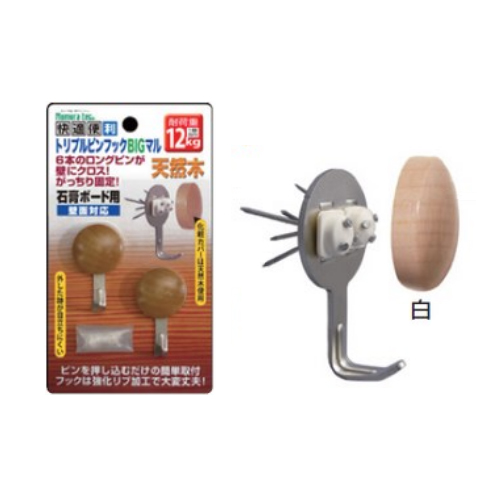 [本体サイズ]28×46×17mm [色]ホワイト [形]BIGマル [耐荷重]12kg [特徴] ・6本のロングピンが壁にクロスしてガッチリ固定。 ・シックな木目、フックは高級感のあるメッキ仕上げで色々なイメージのお部屋でご使用になれます。