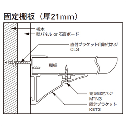 ・壁面にレールなしで自由な取付が可能です。 ・未使用壁面の利用が可能です。 [色]シルバー [品番/呼称]KBT3 [サイズ]長さ450mm [重量]0.7kg [材質]アルミ [ご注意] ・LB:ライトブラウン MB:ミディアムブラウン HB:ハニーブラウンです。 ●セット内容(用途):(1)本、(6)4本、(4)左右各1 ヶ、(5)4本