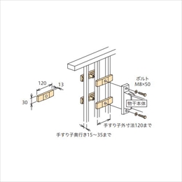 手すり格子へのハサミ付パーツ [材質] ・手すり子パーツ座/アルミダイカスト(塗装仕上) ・パッキン/SPVC ・高ナット/真鍮 ・ネジ類/ステンレス(塗装仕上) [サイズ] ・手すり子外寸法:120mmまで ・手すり奥行き:15〜35mmまで [色]ライトブロンズ色 [ご注意]物干1本に対して1袋必要