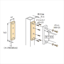 面付パーツ [材質] ・取付金具/アルミダイカスト(塗装仕上) ・ネジ類/ステンレス(塗装仕上) [色]ステンカラー [サイズ] ・ボルト:M8×25 ・ドリルネジ:φ5×25 ・厚さ2mm以上 [ご注意]物干1本に対して1袋必要