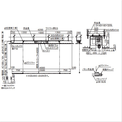 [品番/呼称]BID-4040 [ボックスサイズ内寸]205mm×205mm×4200mm [重量]72.5kg [バトン棒]Φ38 BL=4000mm [吊点数]2点 [標準ストローク]4.0m [制御]DC24V [許容積載荷重]60kgf(90W)