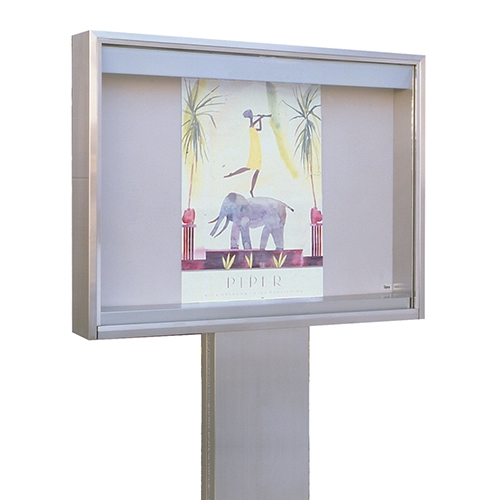 屋外掲示板 ガラス戸降下式(1本脚) [サイズ]1050×1400 [重量]85kg(ガラス含む) ●本体:ステンレス(SUS304) 1.5t ヘアライン・鏡面仕上 ●掲示板:耐水ベニヤ 樹脂シート貼り(色:ライトグレー)、背面板 ステンレス(SUS304) 1.0t ヘアライン仕上 ●ガラス戸:強化ガラス4mmt 上下スライド装置付 ●錠前:オリジナル錠 ●照明:LED蛍光灯(40W相当) 1本 ●脚:ステンレス(SUS304) 1.5mmt ヘアライン・鏡面仕上 W400×D130 1本 27kg、スチールアングルL-50×50×4-300 2本 ●掲示スペース:H810×W1310