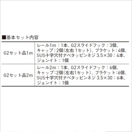 [色]シルバー [サイズ]1000L [付属部品]レール1m:1本、G2スライドフック:3個、キャップ:2個(左右 1セット)、ブラケット:4個、SUS十字穴付ナベタッピンネジ 3.5×30:4本、ジョンイト:1個 [材質]アルミ・SUS303・ジュラコン [仕上げ]アルマイト