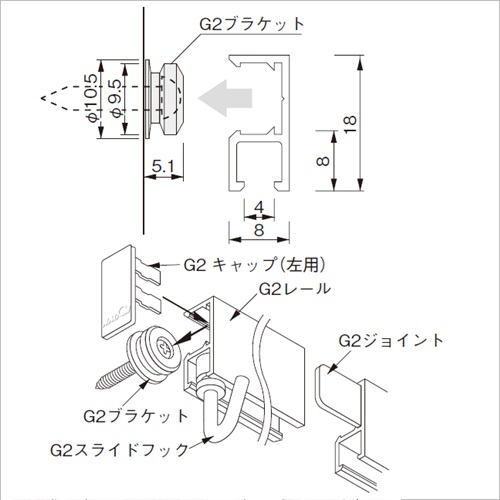 ・推奨荷重:5kg(ネジピッチ300mm以内) ・レールのジョイント及び端部の50mm以内に、専用のG2ブラケットで取付けてください。