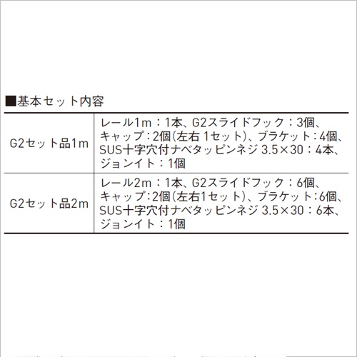 [色]マットシルバー [サイズ]1000L [付属部品]レール1m:1本、G2スライドフック:3個、キャップ:2個(左右 1セット)、ブラケット:4個、SUS十字穴付ナベタッピンネジ 3.5×30:4本、ジョンイト:1個 [材質]アルミ・SUS303・ジュラコン [仕上げ]電着塗装