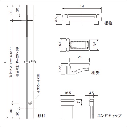 シンプルを極めた美しいデザインの棚柱です。 従来の棚柱は正面に棚受け取付穴が有り構造体として主張していましたが、取付け位置を両サイドにすることによって正面をフラット化し、 壁面と一体化します。 棚板の高さ調整は、20mmピッチで行えます。 棚板1枚あたりの安全荷重は30kgFです。(棚板900×600mm以下、棚柱4本・棚受4個使用)棚受は両サイドの凹部に取付けるので正面はフラットになり壁面と一体化します。 棚受はラバー付で棚板が滑りにくくガラス棚板などにも最適です。 棚受はワンタッチ式でスピーディーに棚板の高さ調整が行えます。 エンドキャップは棚柱の両端を保護します。 差し込むだけで棚柱に固定できます。 グッドデザイン賞受賞 [サイズ]14mm×1820mm [本体重量]125g [材質]アルミ・硬質塩ビ [仕上]アルマイトシルバー 【ご注意】柱本体をカットしてご使用になられる場合、柱裏面のA部寸法を6mm以上 残してカットし、状況に応じてエンドキャップのB部分をハサミ等でカットして取付けてください。