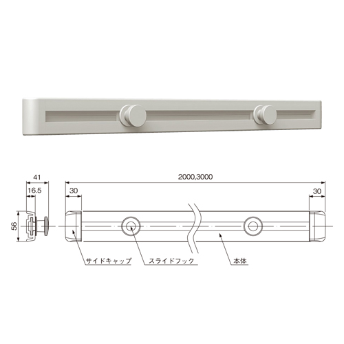 可動式スライドフック付きでお好みの位置にフックを移動することができます。 シンプルモダンな内装イメージにマッチする、シンプルでありながらもクール(素敵)なハンガーです。 [サイズ]3000x56x41mm [本体重量]1430g [材質]本体:EASA ●備考:サイドキャップ 2個、スライドフック 9個、内装ビス 11本 ●耐荷重:30kgf 【ご注意】取付けには下地補強が必要です。木下地がなく、コンクリート下地に直接施工する際には市販のアンカーボルトを使用し、確実に施工してください。1つのフックに5kgF以上、1m当たり10kgF以上の物は掛けないでください。